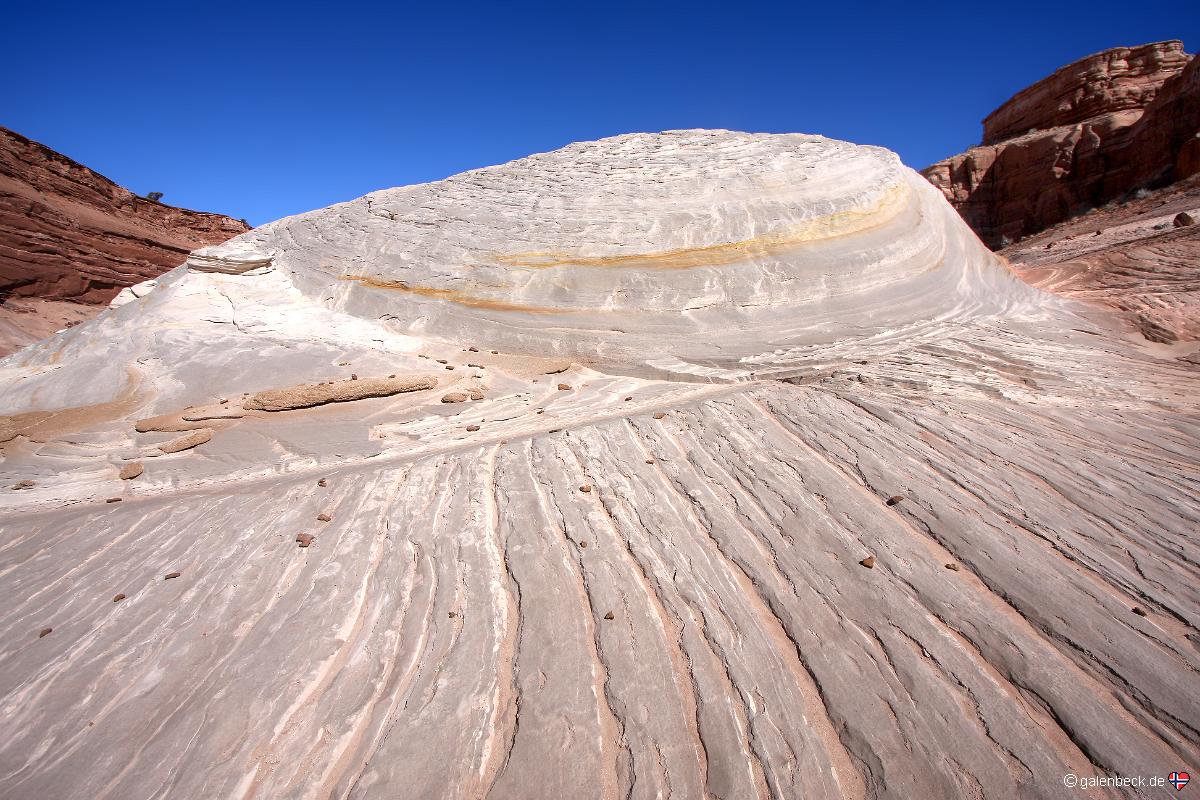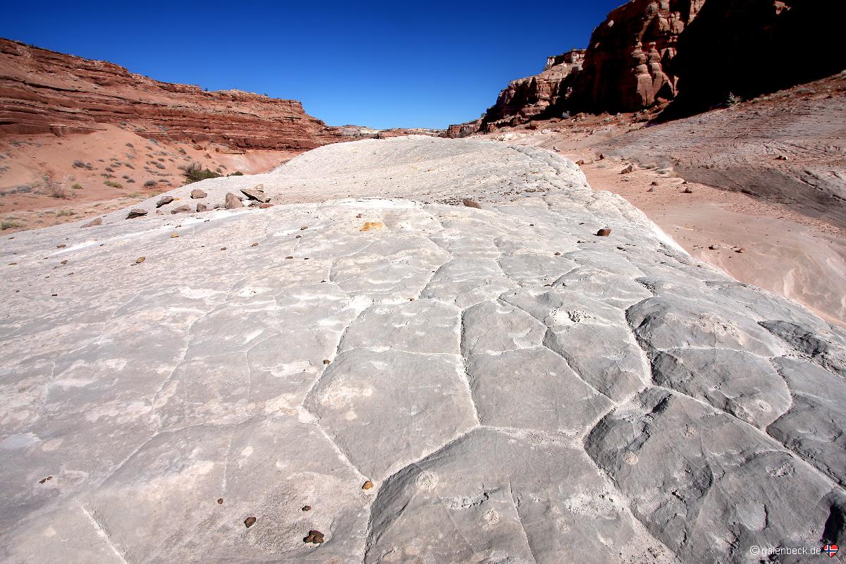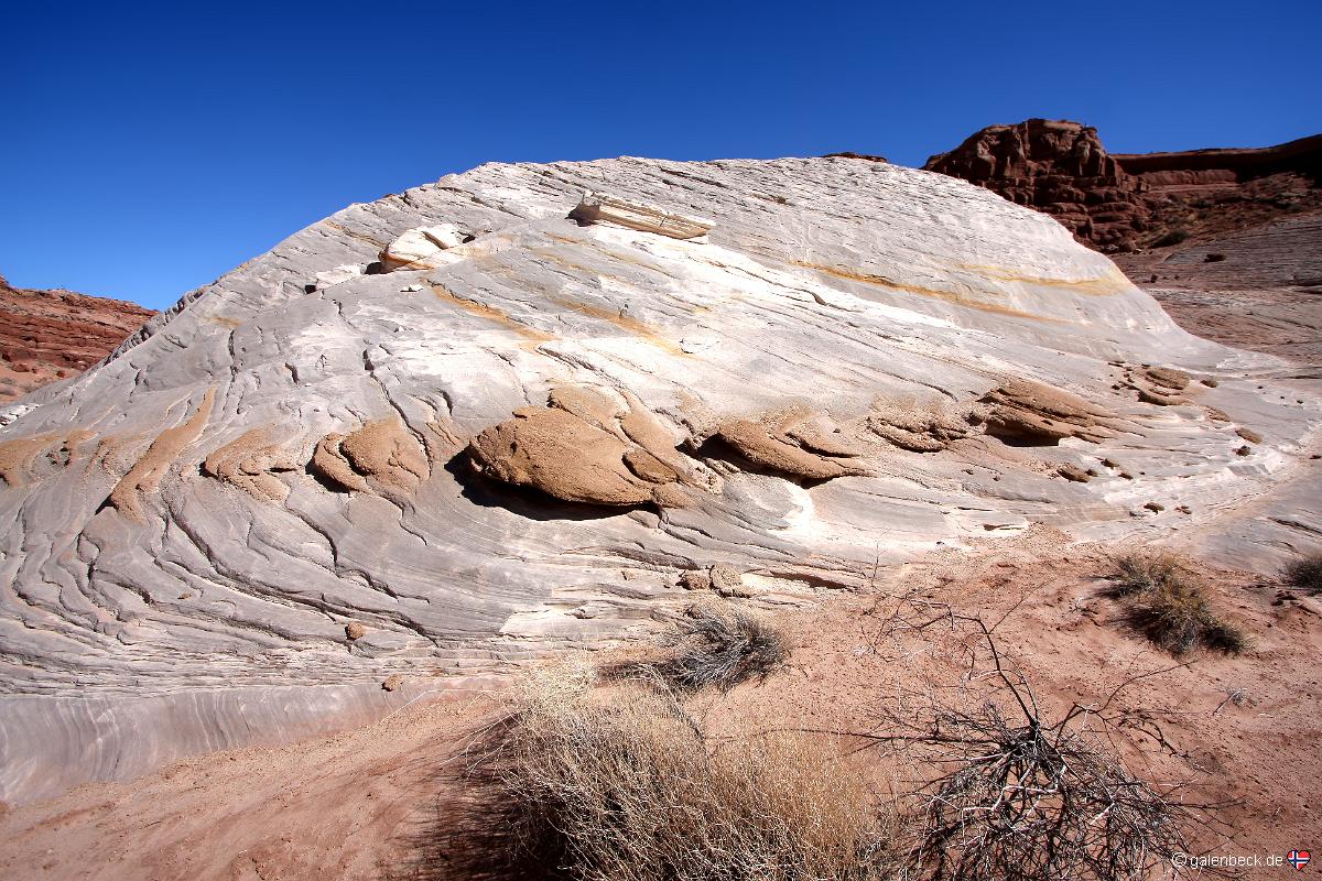 Felsen, der mitten im Wash zu liegen scheint. Zu diesem